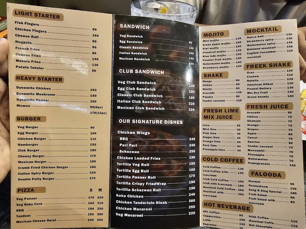 Welcome to Swig n Sing Music Cafe, a delightful spot on Puranattukara Rd, Thrissur, where culinary delights meet melodious tunes. The menu features a tempting array of options that cater to all tastes. From refreshing shakes like Mango and Avocado to vibrant fresh juices such as Pomegranate and Watermelon, there's something to quench everyone's thirst. For coffee lovers, the Cold Coffee selections, including the indulgent Irish Cold Coffee, promise a rich experience.
